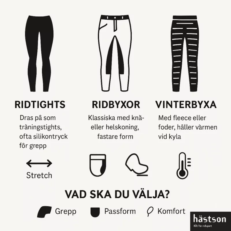 Att välja rätt ridbyxa är viktigare än många tror. En byxa som skaver, glider ner eller är för kall kan snabbt ta bort glädjen i både ridning och stallvistelse. Den här guiden hjälper dig att förstå skillnaden mellan de vanligaste modellerna, vad som passar till olika tillfällen – och vad du ska tänka på när du väljer ridbyxa till dig själv eller till barn.