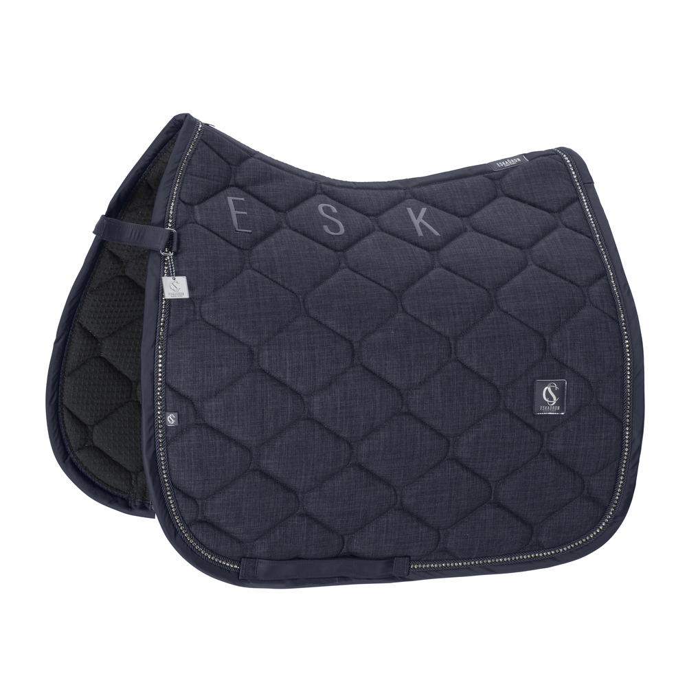 BOUCLÉ CRYSTAL Schabrak bouclé-yta, våffelpiké i bomull inuti stor quiltning med medeltjock fyllning halkfria silikonytor i sadelområdet kristallsnörepasspoaler på glansigt band innostrap-system gjordrem med trippelfäste emblem på båda sidor flaggetikett på båda sidor med Eskadron-hänge Material 100% POLYESTER