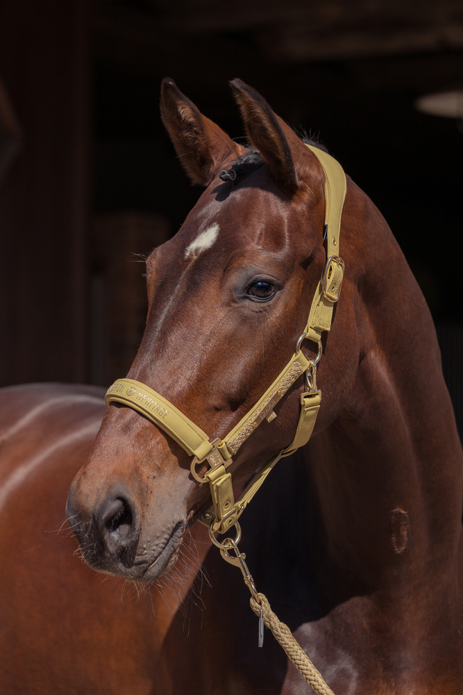 Grimma i konstläder med vävfoder. Anatomiskt huvudbonad med Eskadron-logotyp. Flätad lurexsnöre på kindstyckena. Spännen på båda sidor. Justerbar hakrem Guldfärgade metallbeslag Heritage metallic-bokstäver på nosgrimman Eskadron metallplakett på vänster sida