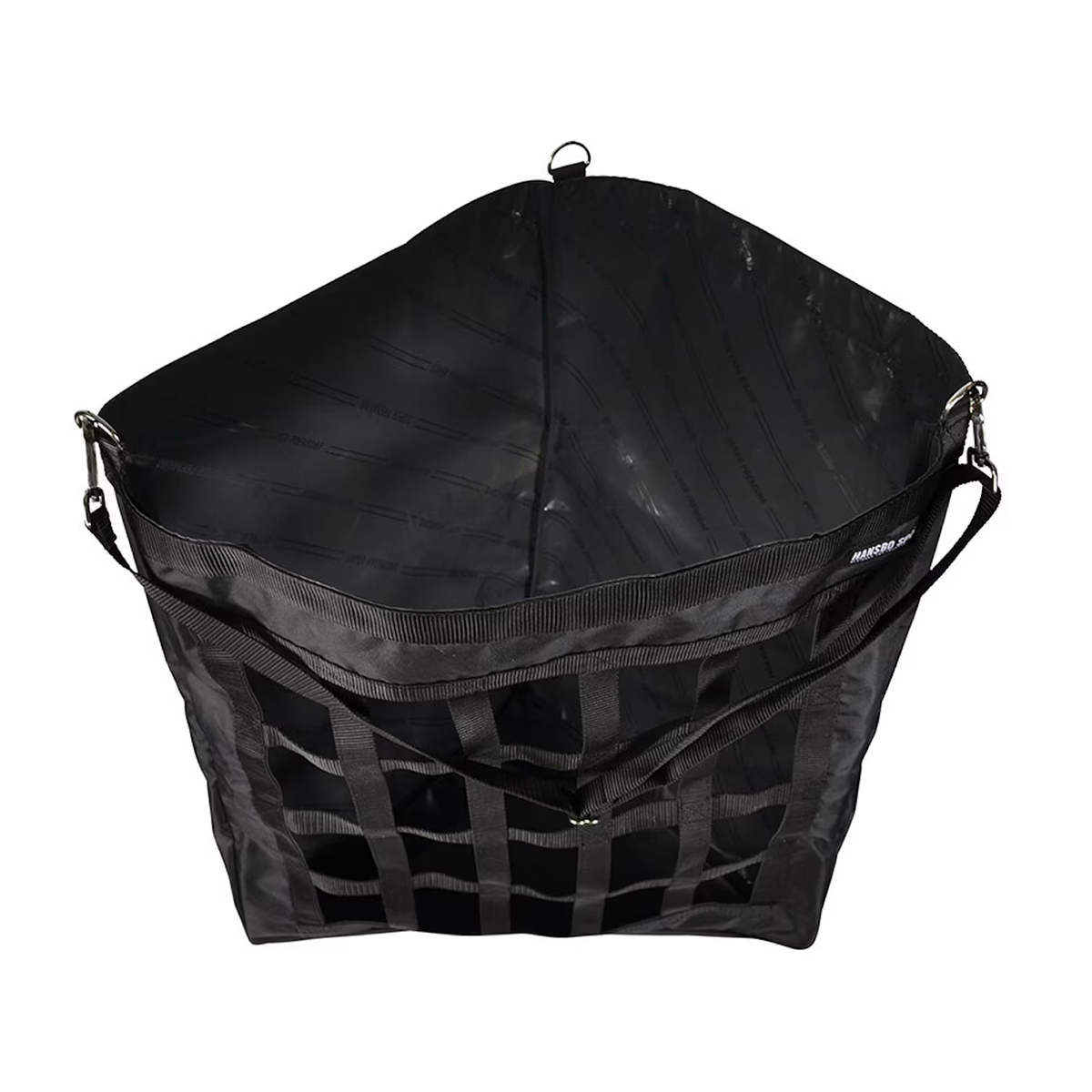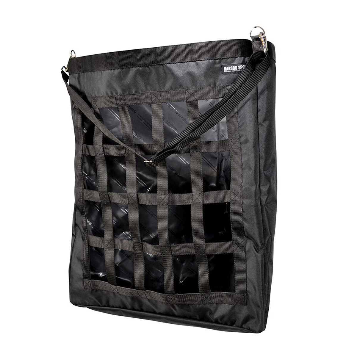 Trekantig höpåse/ hösäck med slowfeed (9 x 6 cm) framsida för upphängning i hörn. Lämpar sig både i boxen och transporten. Designad med D-ringar för upphängning.