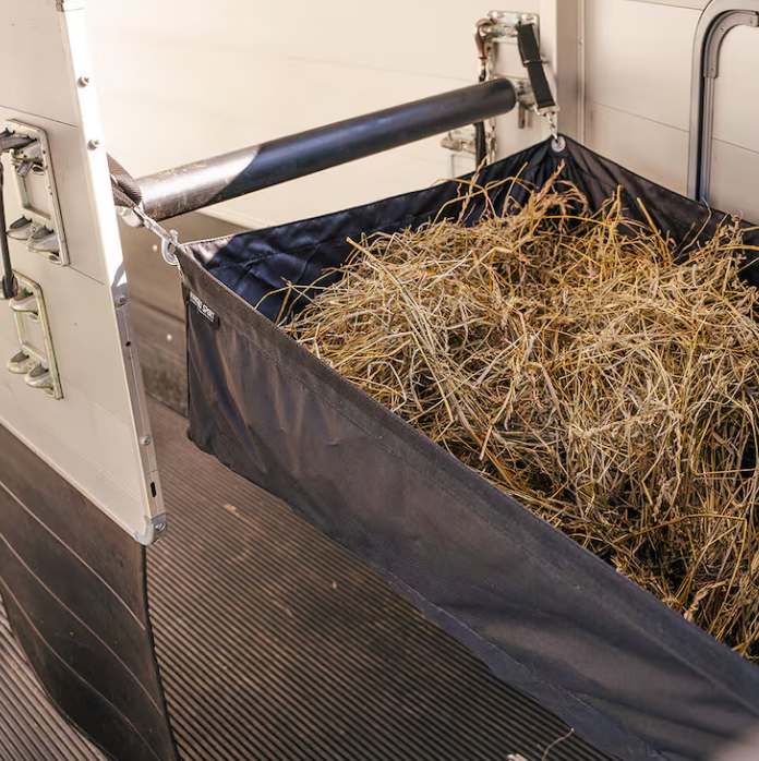 Funktionellt hösegel i fyrkantig modell, som passar både lastbil och hästtransport. Förstärkta hål med tillhörande hakar för upphängning. Djup ca 25 cm
