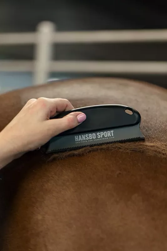 Multifunktionell pälsfällningskam / pälsborttagare / pälsskrapa för alla typer av pälsdjur. Kammen går lika bra att använda på på hästen som på hunden eller stallkatten. Kammen har ett greppvänligt handtag med hål för upphängning. Kammen är i gummi med en mjuk, taggliknande struktur som effektivt avlägsnar päls under fällningsperioderna. Kammen fungerar även på schabrak och teddyskydd. Eftersom kammen är tillverkad i plast och gummi är den enkel att rengöra och du kan skölja av den för att få bort eventuellt damm och smuts som fastnat.