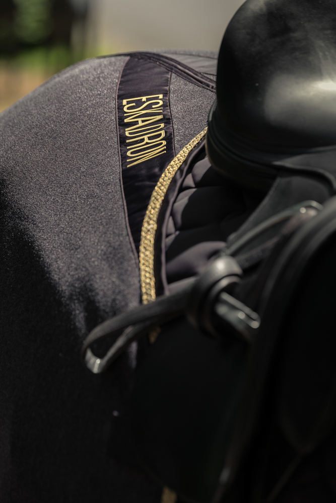 Ovandel i ullakryl, foder i teddyfleece. Flätad lurexsnodd på glansig kant. Glansband med Eskadron-logotyp på båda sidor. Kardbocka för fastsättning vid sadelgjorden Integrerad svansrem
