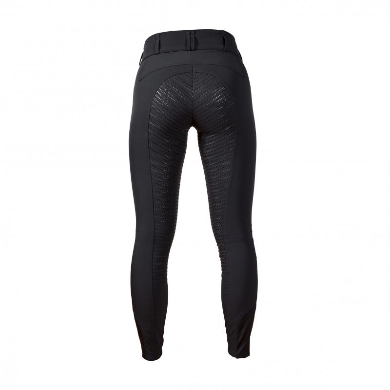 Byxans höga midja med bred linning ger extra stöd och komfort, vilket gör att den sitter stadigt på plats utan att glida. Perfekt för ryttare som vill ha en ridbyxa som både är bekväm och praktisk.