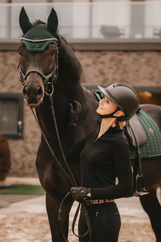 Klassisk och snygg tävlingshuva från Kentucky med fina detaljer och sömmar. Förlängd halsdel för att undvika att den glider under tränset och säkerställa att den sitter bra på plats.